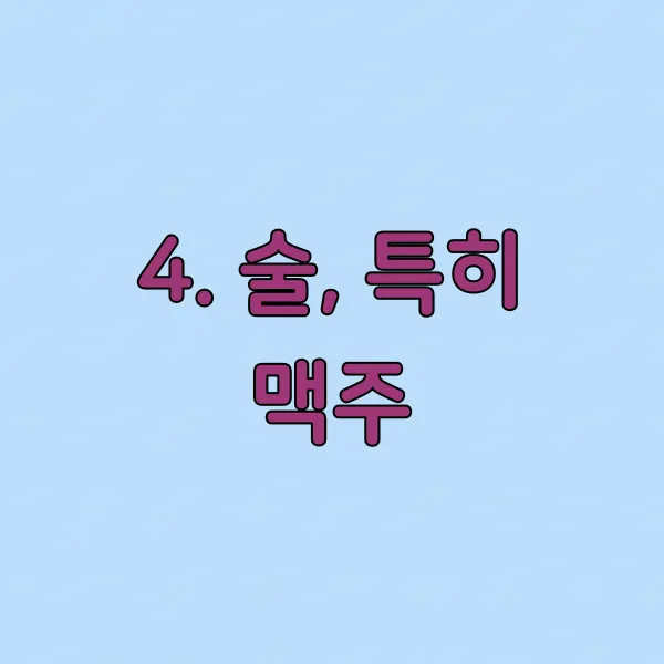 통풍 관리에 있어 술은 정말 피해야 할 대표적인 음식입니다. 술은 체내에서 요산 생성을 늘릴 뿐만 아니라, 신장의 요산 배출 기능을 방해하기 때문입니다. 그중에서도 맥주 는 퓨린 함량이 높고 과당도 포함하고 있어 통풍에 가장 좋지 않은 술로 알려져 있어요.
